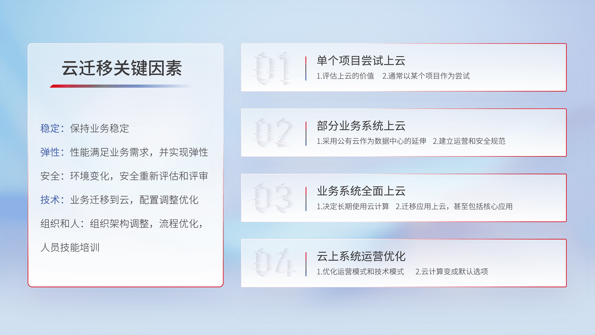 结合实际业务,,,从规划设计、、云平台选型、、云原生改造、、、、数据迁移、、集成交付,,,,迁移全过程为客户识别最佳上云路径,,,,做好风险识别管理,,,,设计网络架构、、、身份权限、、、、安全审计合规、、、操作审计、、、日志审计、、监控告警策略、、、、多站点容灾设计等,,,对云上基础设施进行整体规划,,,提升IT治理水平,,以满足弹性、、、、高可用、、、、高性能的需求。。。。
