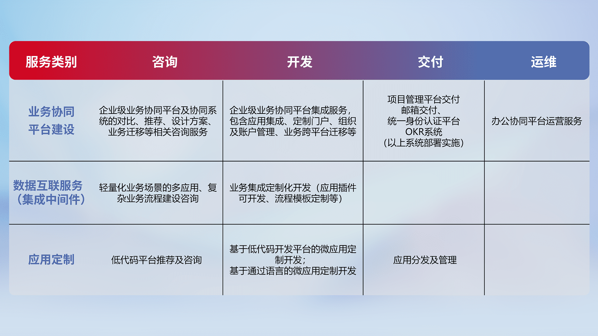 针对钉钉、、、企微、、、IDaas等平台级产品提供产品的规划、、方案、、、、交付、、、、定制化开发等服务,,实现如统一协同办公、、、、智能客户服务、、、、混合会议管理、、智能数据查询、、、、等业务场景,,实现数字化转型。。。。